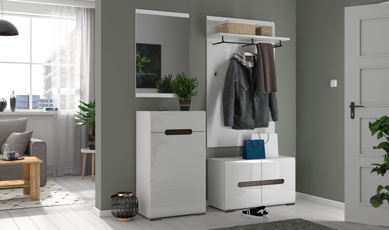 код 152045Коллекция модульной мебели с белыми глянцевыми фасадами для прихожей. Материал: МДФ, ЛДСП.
