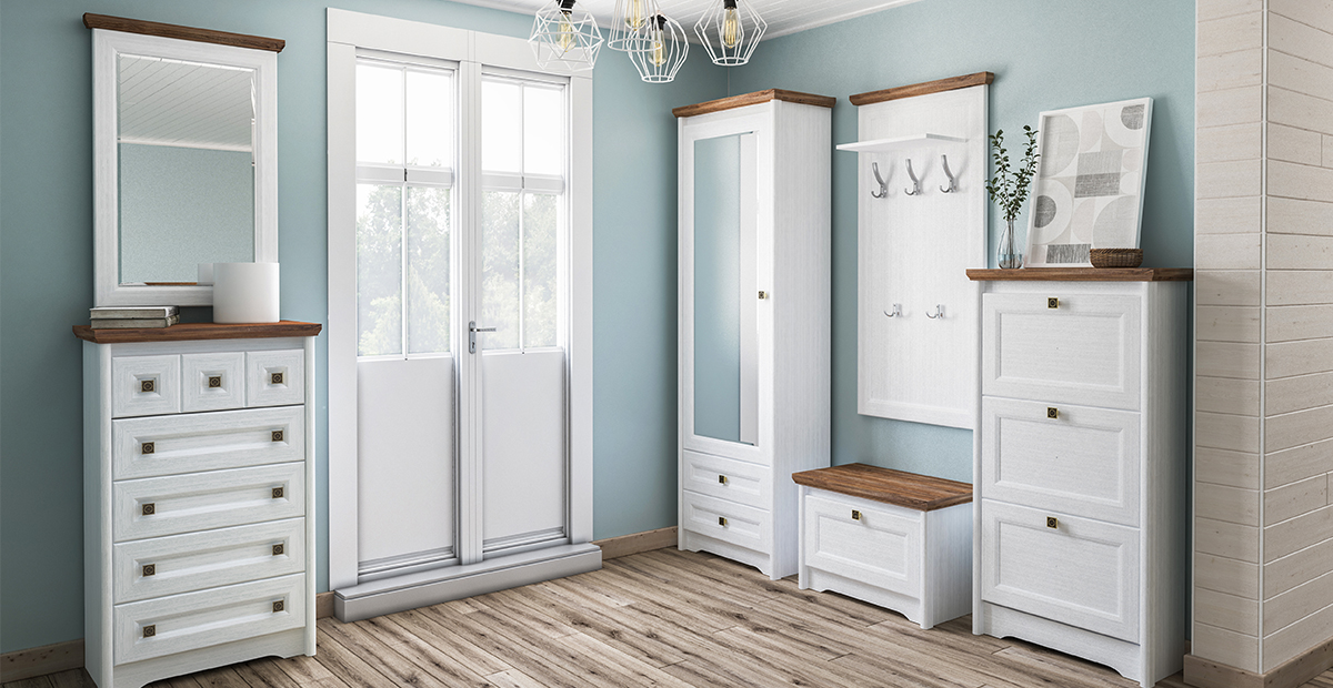 Отличительной чертой стиля «лёгкого кантри» является применение в дизайне не более трёх основных цветов. В качестве основного выступает белый со структурой под дерево, а в противовес ему для создание контраста идёт тёмный цвет с текстурой дуба. Такая универсальная цветовая гамма мебели легко впишется в большинство интерьеров и будет идеальным решением для владельцев любой квартиры или дома.