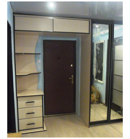 Модульная система имеет арочную форму, самым лучшим вариантом будет ее установка у выхода из помещения. Она включает в себя: шкаф-купе, тумбу, полки и антресоли. Шкаф-купе имеет две раздвижные створки с зеркальной поверхностью, декорированной пескоструем.
