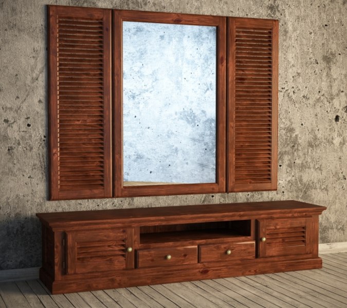 Набор мебели из массива дерева с жалюзийными фасадами в колеровке под орех. В наборе представлены зеркало с деревянной рамой и ставнями, широкая тумба с нишей и двумя шуфлядами по середине, а также с двумя отделами по краям с дверцами. Конструкция позволяет сделать интерьер помещения более уютным и функциональным. Большое зеркало способствует визуальному увеличению пространства.