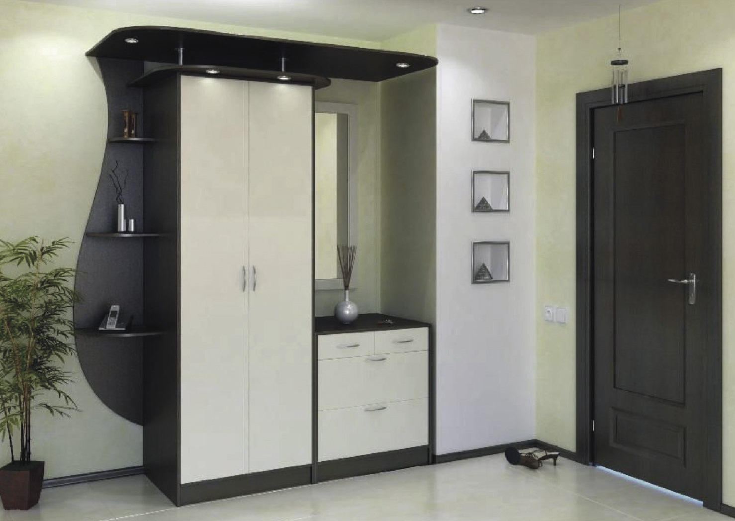 Состоит из отдельностоящих модулей: шкафа+ вешалки+ зеркала и обувниц.