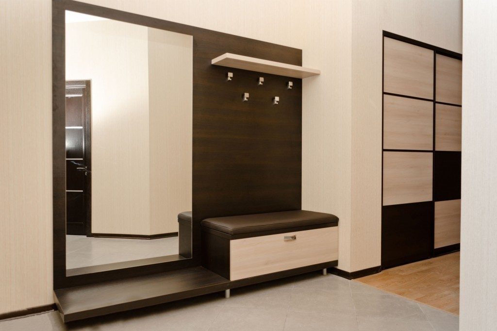 Тумба обувная из ЛДСП с ящиком и нишей для зонтов и сумок, настенное зеркало.