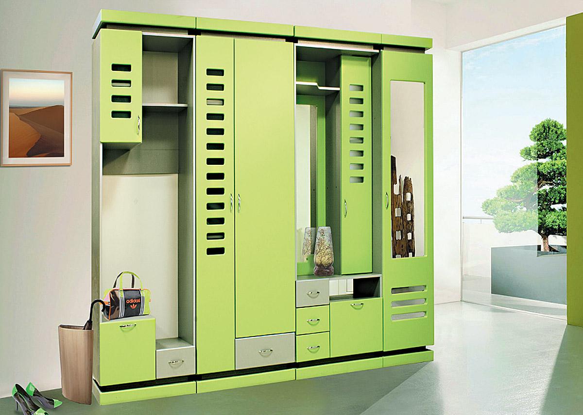Универсальный набор мебели для узкой прихожей в темном древесном оттенке.