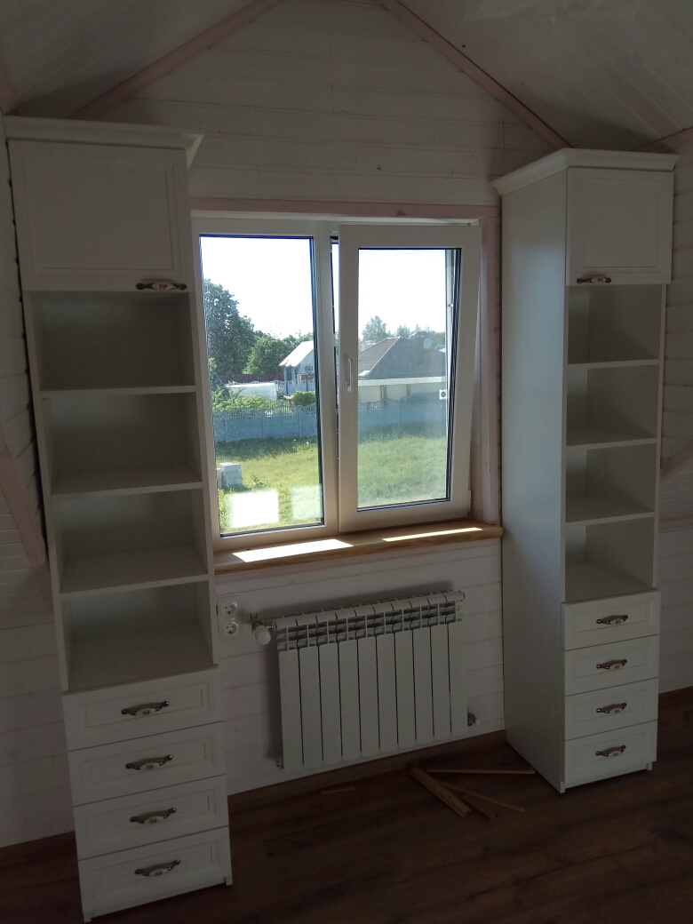 Два шкафа с открытыми полками и выдвижными ящиками внизу.