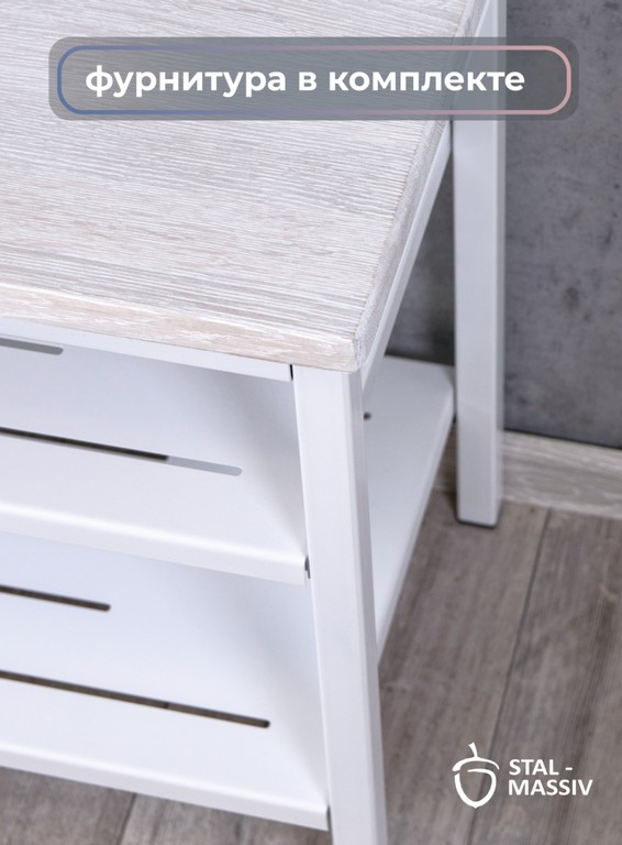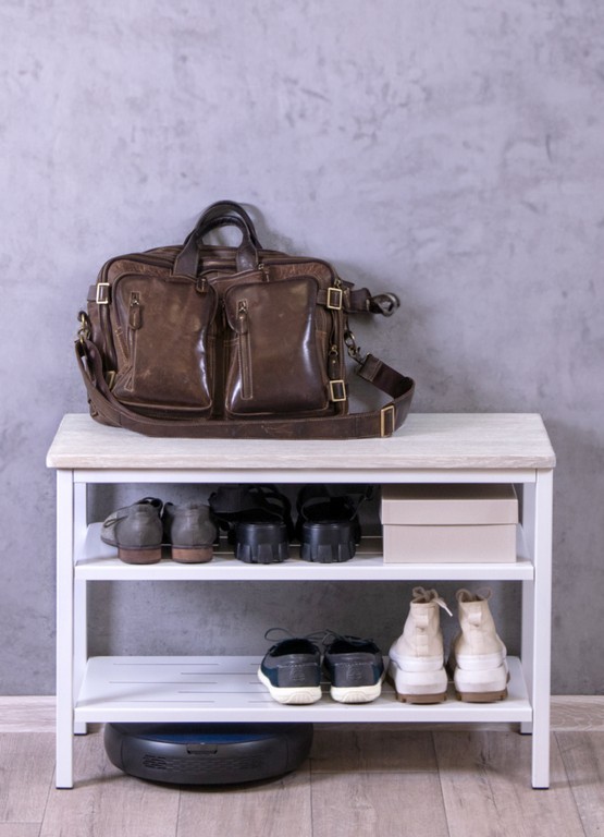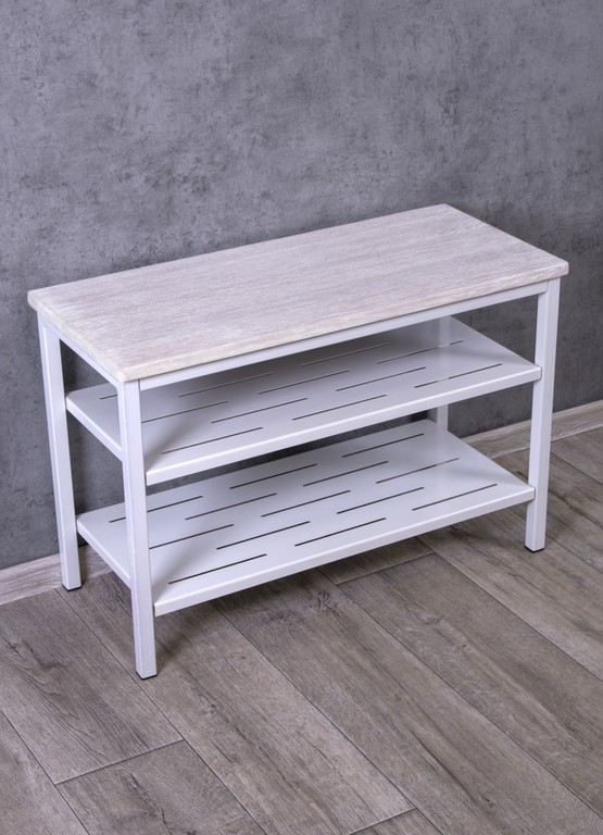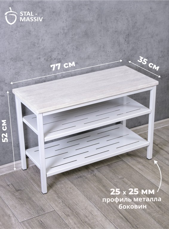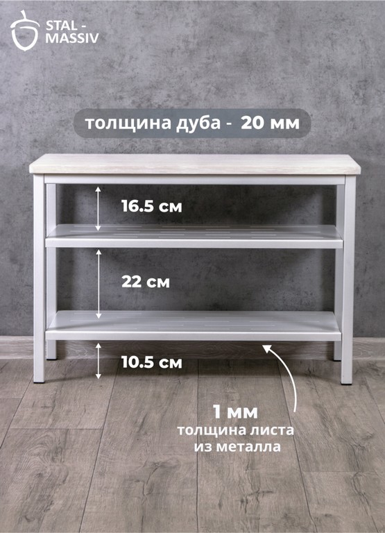 Полимерное покрытие каркаса — устойчиво к воде, царапинам и появлению ржавчины. Сиденье из массива дуба покрыто двумя слоями итальянского масла и специальным воском, которые позволят столу сохранить свой первоначальный вид на протяжении длительного времени. Cтальные полки могут разместить до 6 пар обуви.