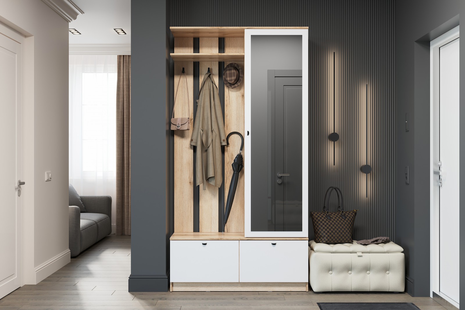 Небольшая прихожая, включающая в себя три модуля: шкаф, обувницу и зеркало. Цвет: венге.