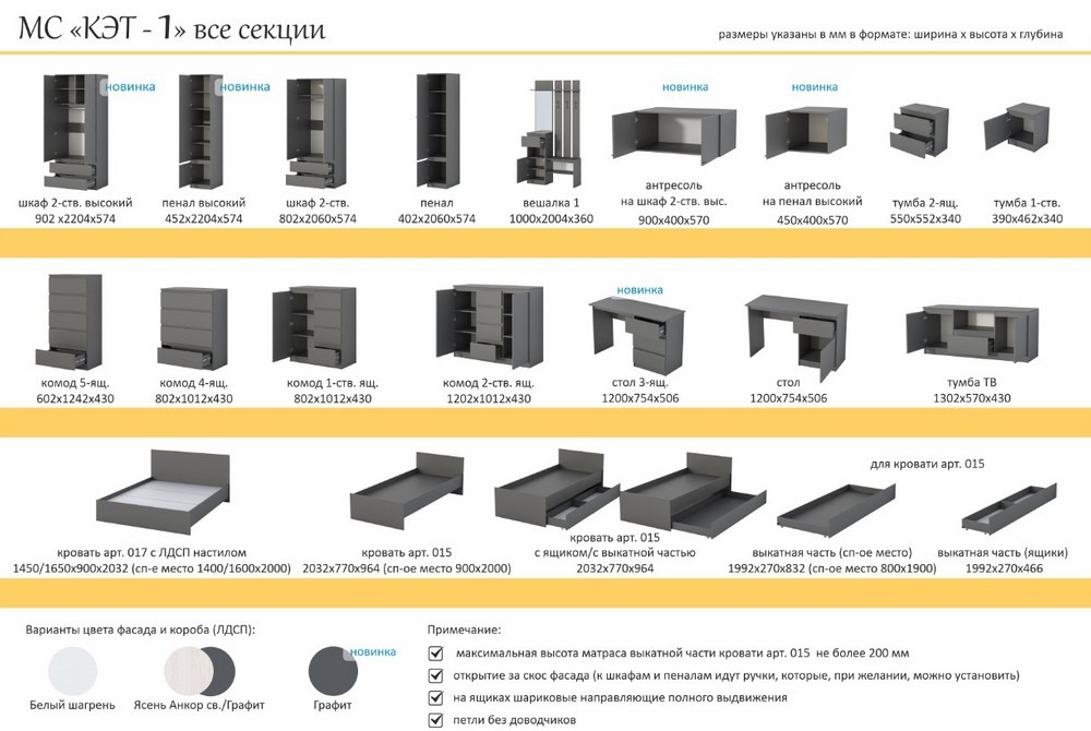 Мебель Кэт 1 — это набор универсальных модулей из которых Вы собираете нужный комплект в комнату.
