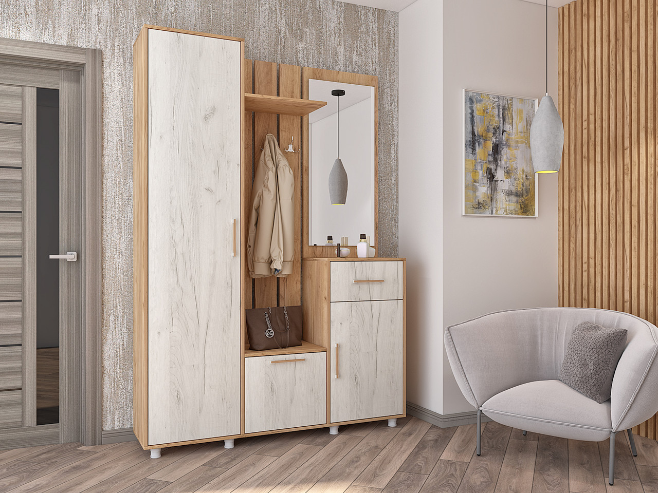 Модульный набор с угловым шкафом, комодом, зеркалом, обувницей и открытой вешалкой.