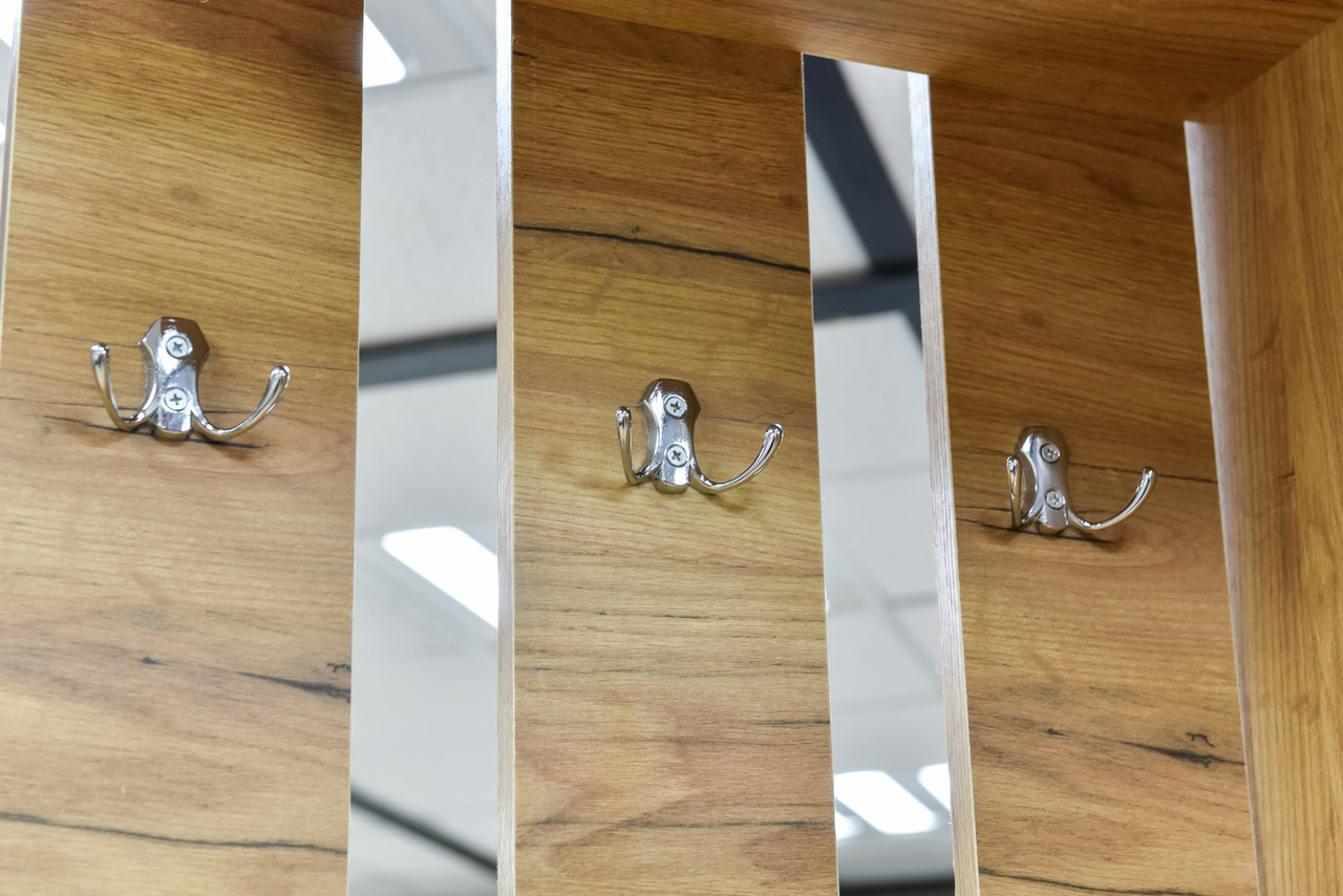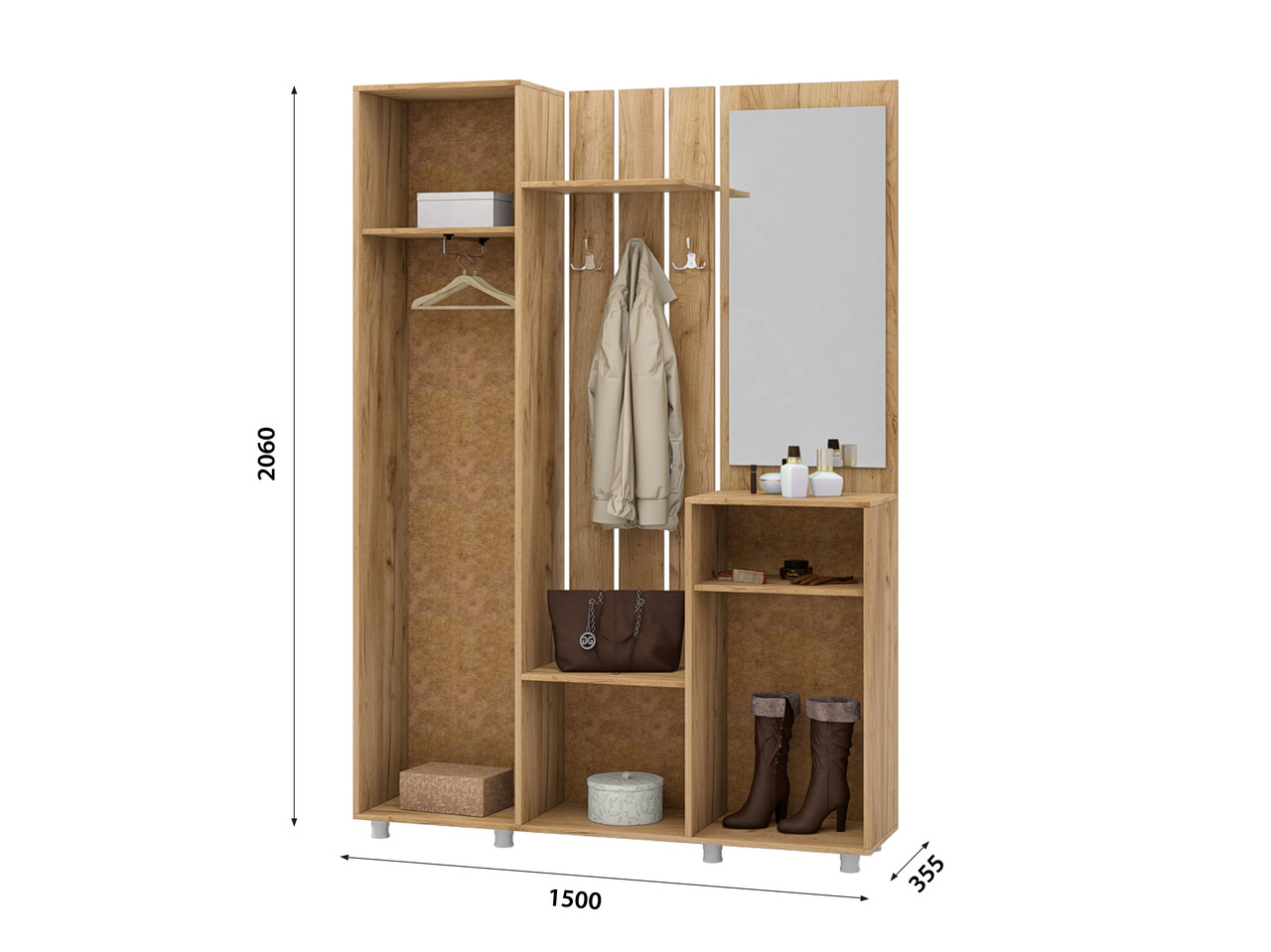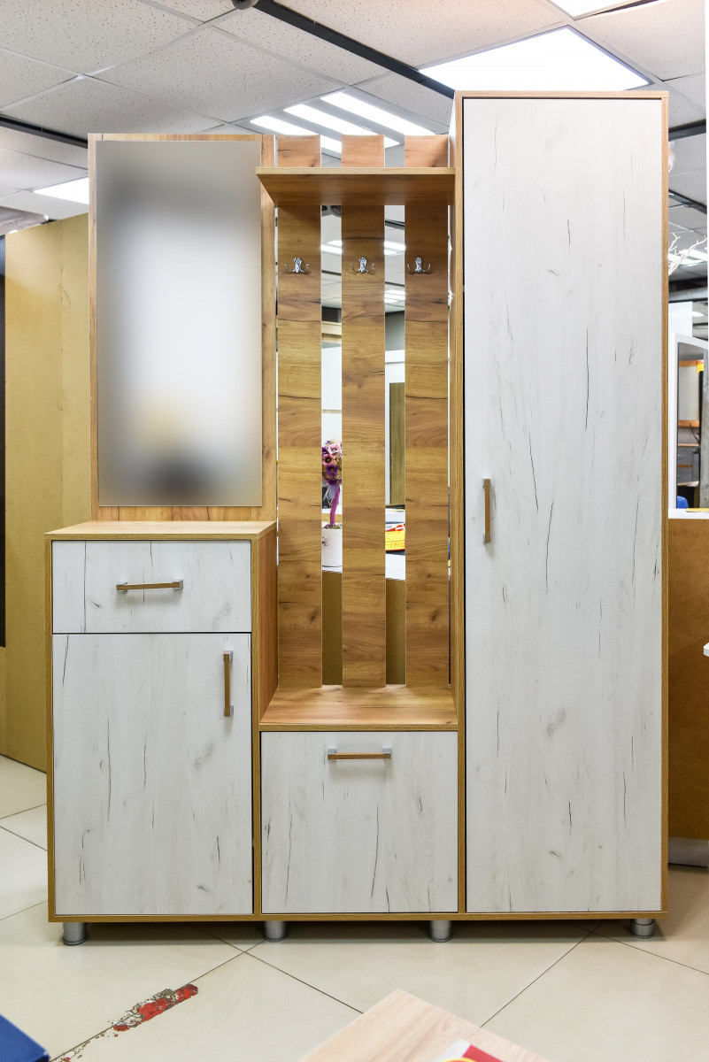 В состав комплекта входит: вешалка, тумба, шкаф, тумба под обувь.
