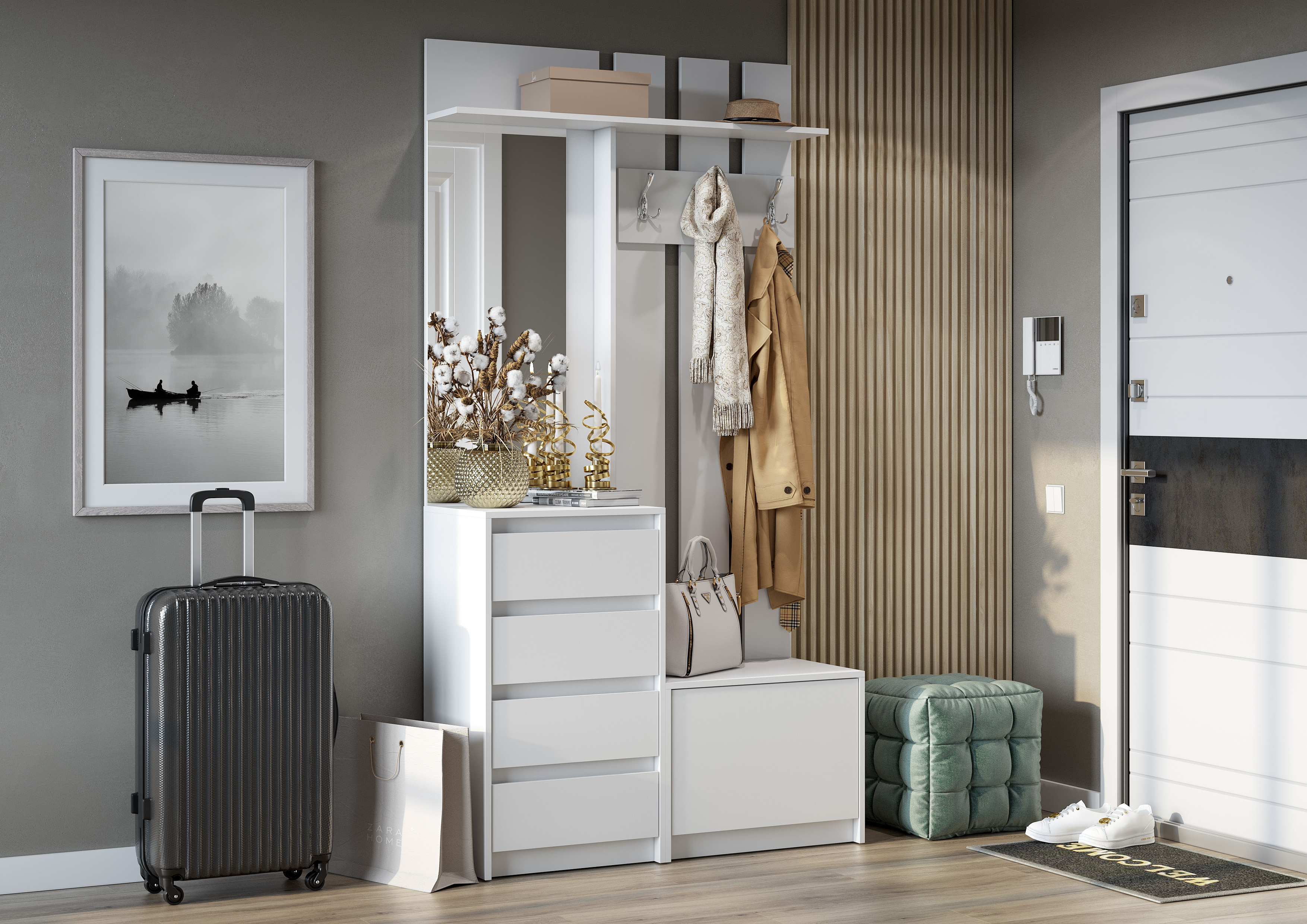 Вешалка с полкой, зеркало, тумба для обуви, подвесная тумба.