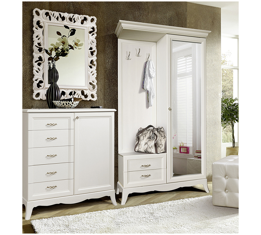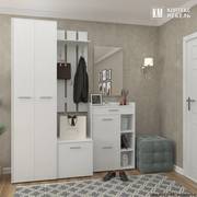 Набор мебели «Амели» для прихожей создаст в помещении стильную и в то же время уютную обстановку. Комплект состоит из двух модулей: шкафа для одежды с тумбой и металлическими крючками, а также комода с выдвижными ящиками над которым можно повестить зеркало. Кроме того, модель укомплектована мягким пуфиком с декоративными пуговицами.