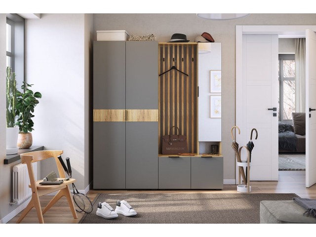 Модульная коллекция мебели для прихожей Бери – это трендовые дизайнерские решения для Вашего интерьера. Стильные рейки МДФ, акцентные крючки, зеркало, в котором можно себя увидеть в полный рост и шкафы для хранения Ваших вещей делают эту компоновку прихожей не только модной, но и функциональной. В данной прихожей стоит обратить внимание на МДФ вставку с фрезерованными вертикальными полосками – это станет украшение для Вашей прихожей. Удобная металлическая ручка-профиль, облегчит открывает дверей шкафа. Сборка у шкафа универсальная.