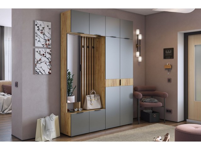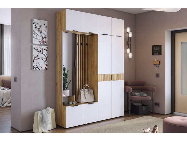 Модульная коллекция мебели для прихожей Бери – это трендовые дизайнерские решения для Вашего интерьера. Стильные рейки МДФ, акцентные крючки, зеркало, в котором можно себя увидеть в полный рост и шкафы для хранения Ваших вещей делают эту компоновку прихожей не только модной, но и функциональной. В данной прихожей стоит обратить внимание на МДФ вставку с фрезерованными вертикальными полосками – это станет украшение для Вашей прихожей. Удобная металлическая ручка-профиль, облегчит открывает дверей шкафа. Сборка у шкафа универсальная.