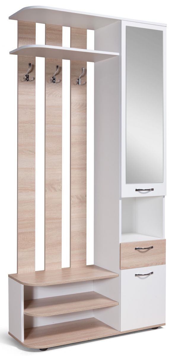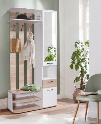 Модульный набор с угловым шкафом, комодом, зеркалом, обувницей и открытой вешалкой.