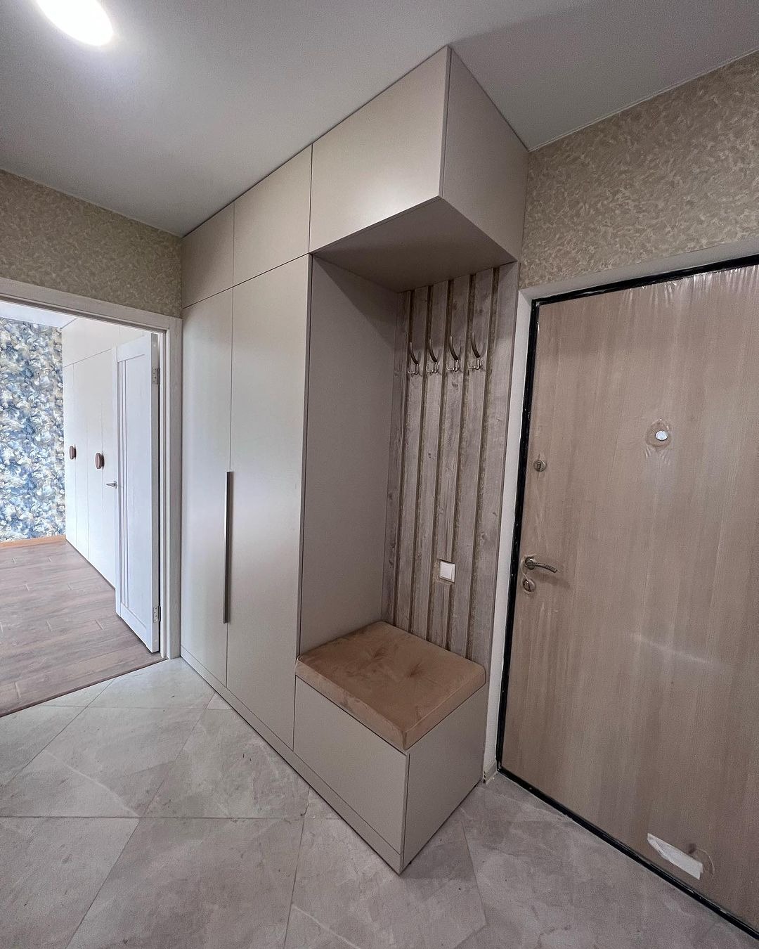 Белая панель с крючками для прихожей. Антресоль для головных уборов.