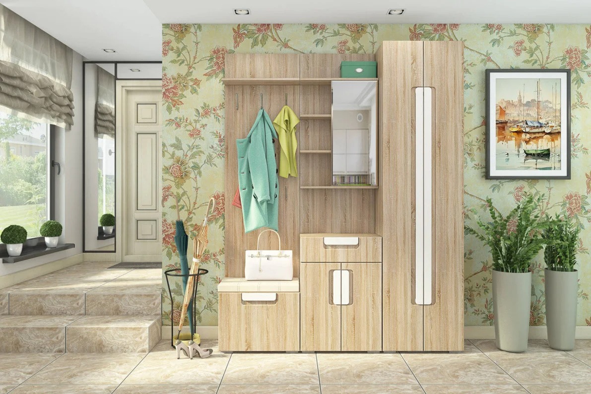 Набор светлых древесных тонов. Шкаф с вертикальным зеркалом во всю высоту.