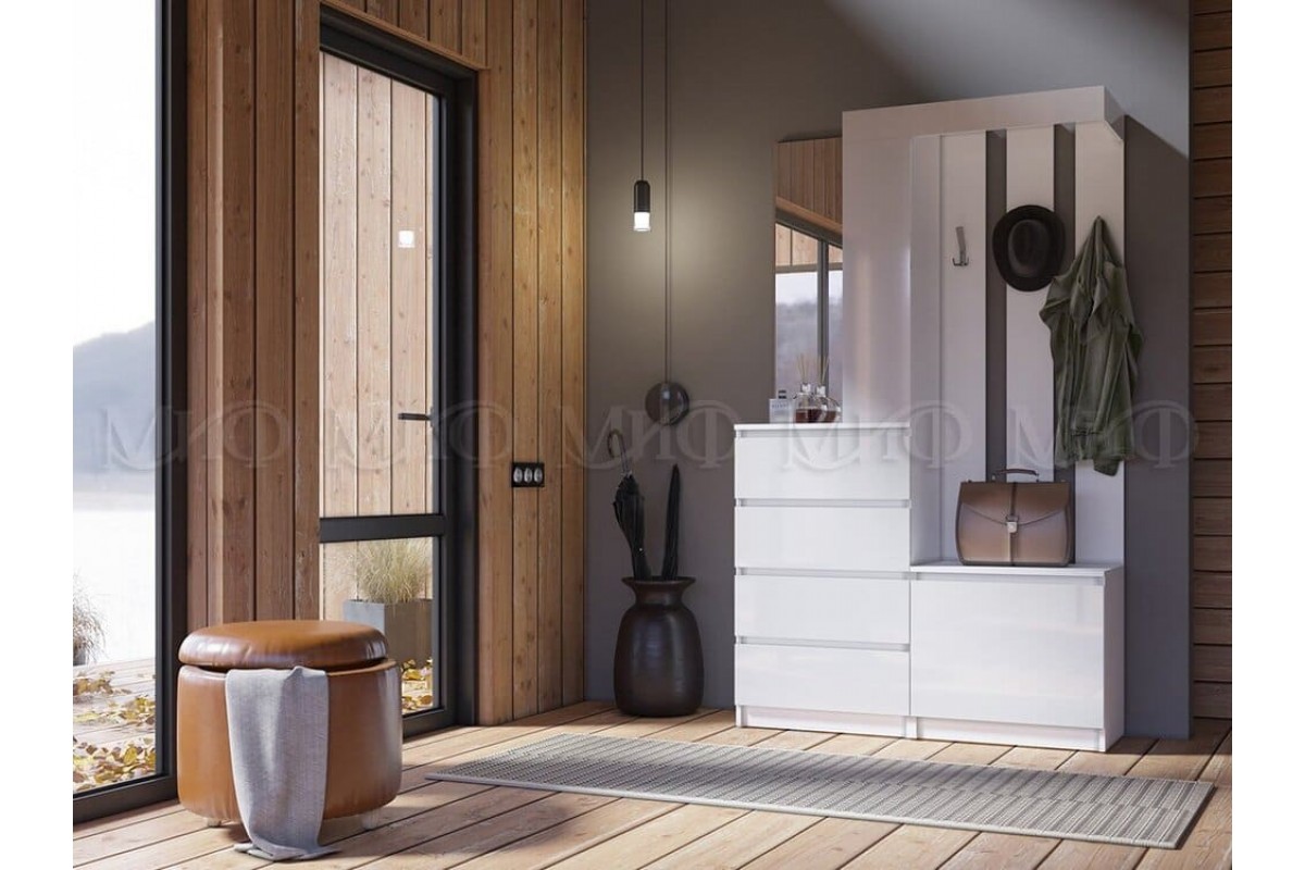 Большой распашной шкаф, тумба с выдвижными ящиками, навесная полка. Глянцевые фасады.