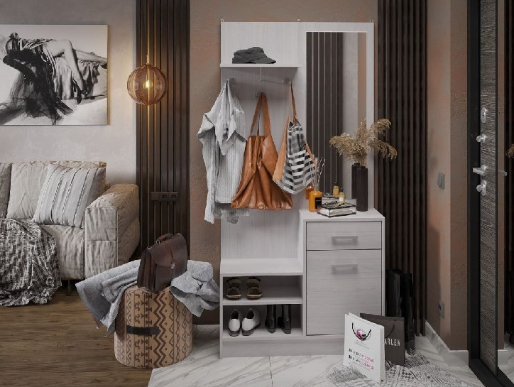 Комплект мебели для прихожей состоит из обувной тумбы и настенной панели с крючками.