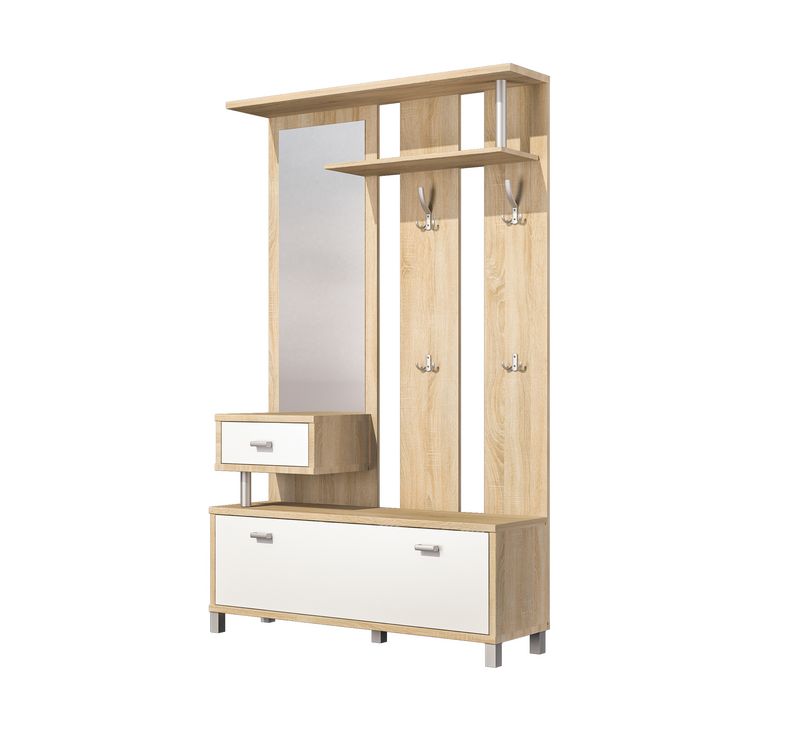 Вешалка имеет верхнюю полку для головных уборов. Тумба содержит одну съемную полку внутри.