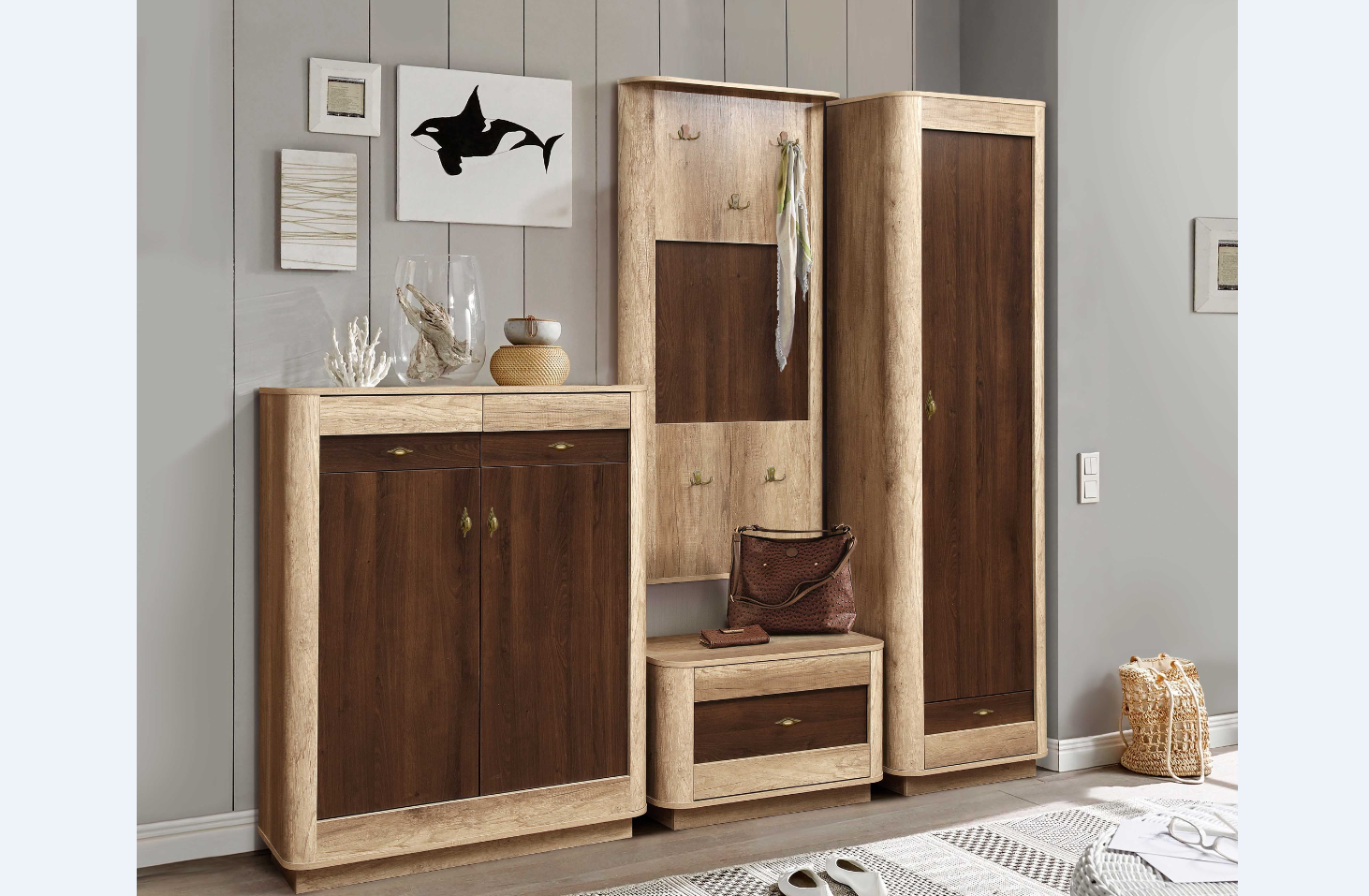Цена указана на комплектацию шириной 2354 мм, которая показана на первой картинке (шкаф для белья, тумба под обувь, вешалка, тумба).