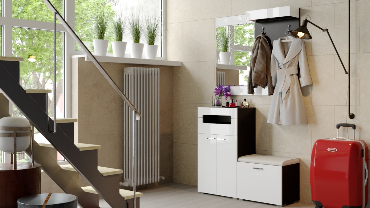 В комплект входит пенал с ящиками и вешалка с обувницей.
