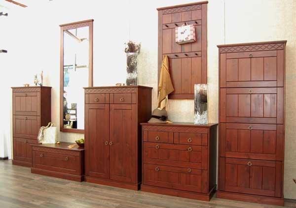 Прихожая «Индра» включает несколько отличных друг от друга по высоте комода и шкафчика, а также высокое подвесное зеркало и стенку с крючками для верхней одежды. Элементы прихожей декорированы резными вставками с узором.