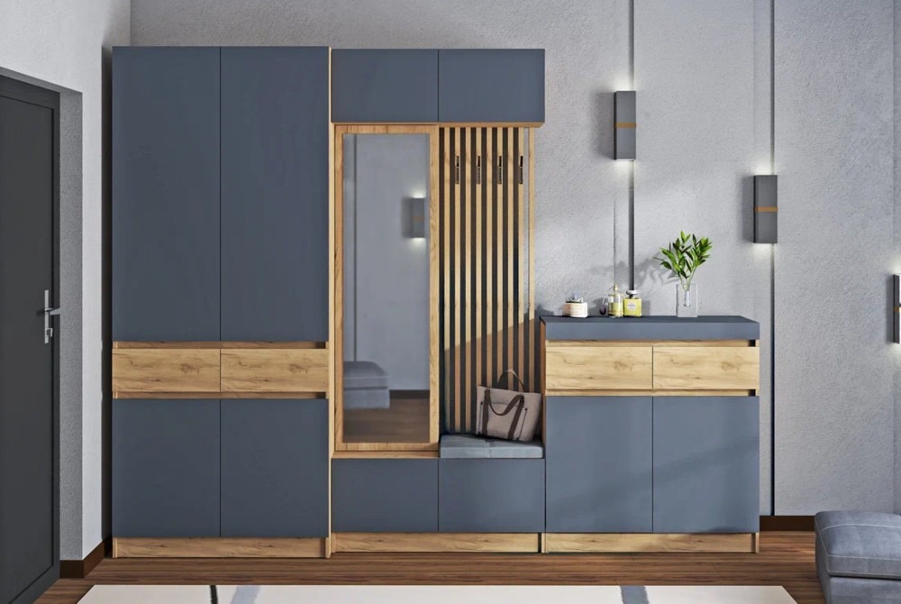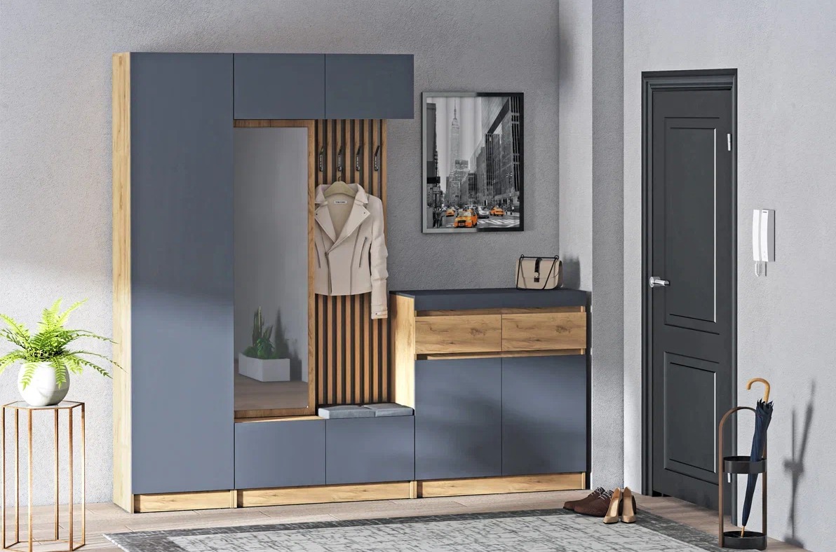 Обувница, зеркало, вешалка с обувницей, распашной 2 ств шкаф, открытые угловые полки.