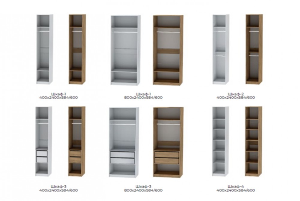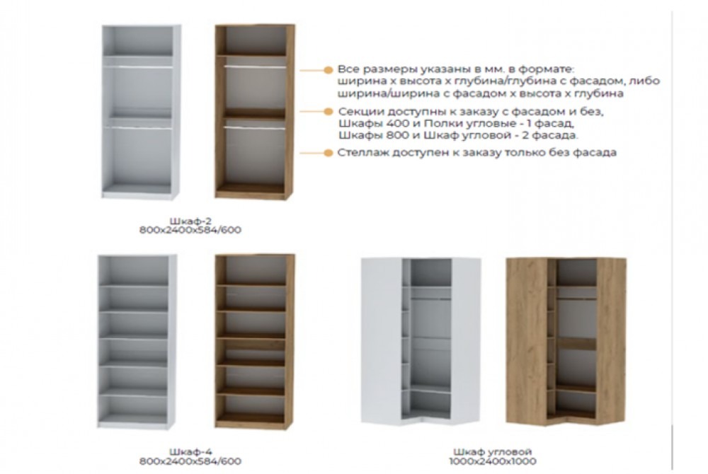 Ширина шкафов может быть выбрана в двух вариантах: 400 мм или 800 мм, а высота составляет 2400 мм. Глубина с фасадом составляет 600 мм, а без фасада - 584 мм.