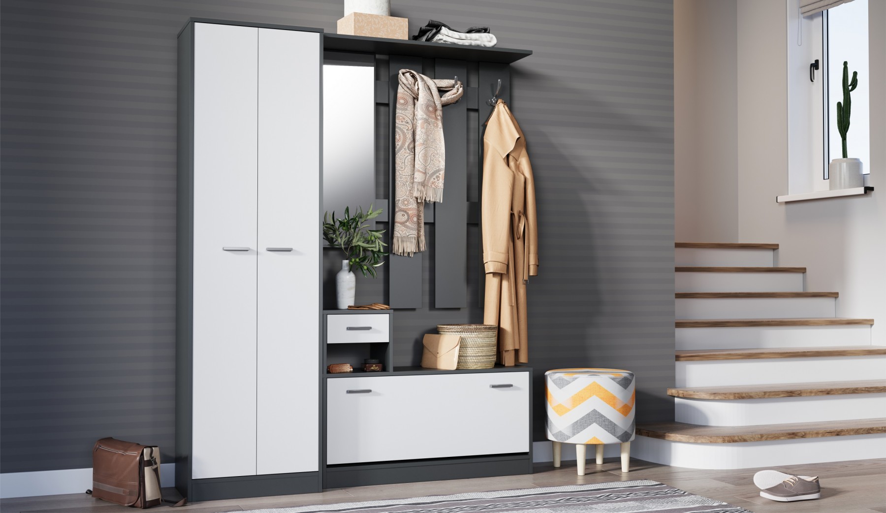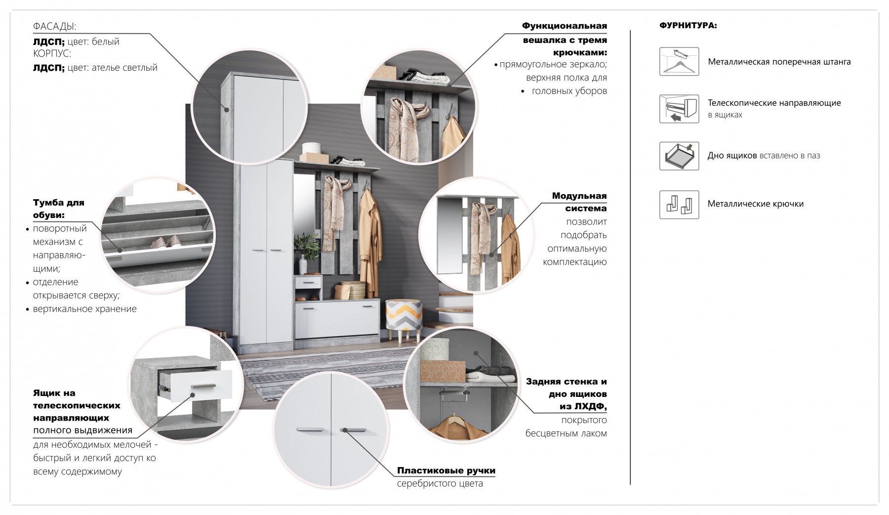 Модульная прихожая , 2160*1000*420. Доступна в цвете светло-сером.