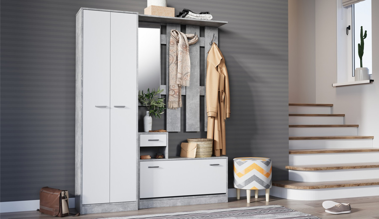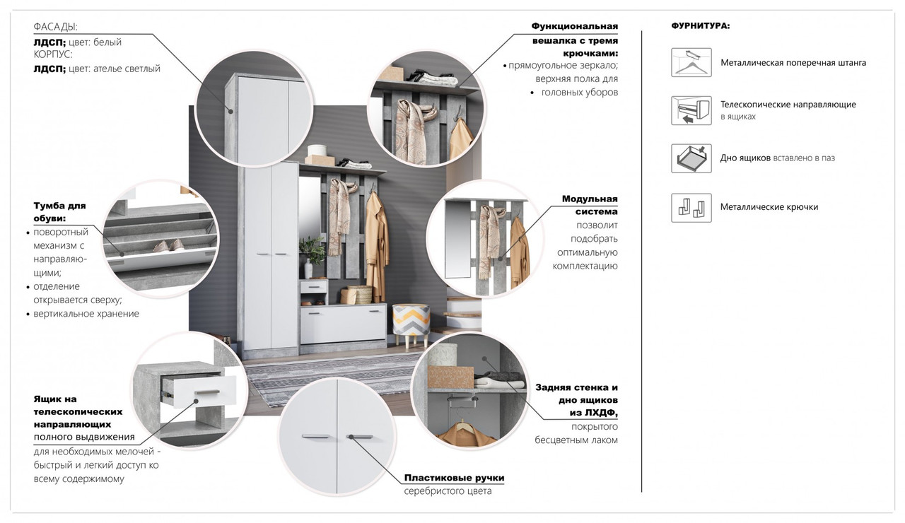 Состоит из отдельностоящих модулей: шкафа+ вешалки+ зеркала и обувниц.
