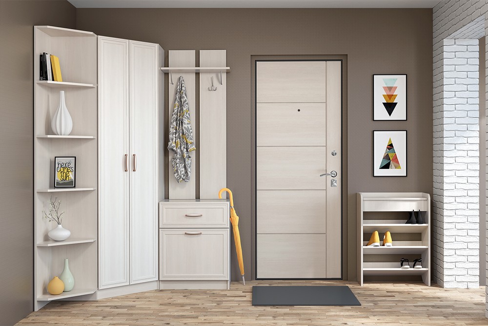 Обувница, зеркало, вешалка с обувницей, распашной 2 ств шкаф, открытые угловые полки.