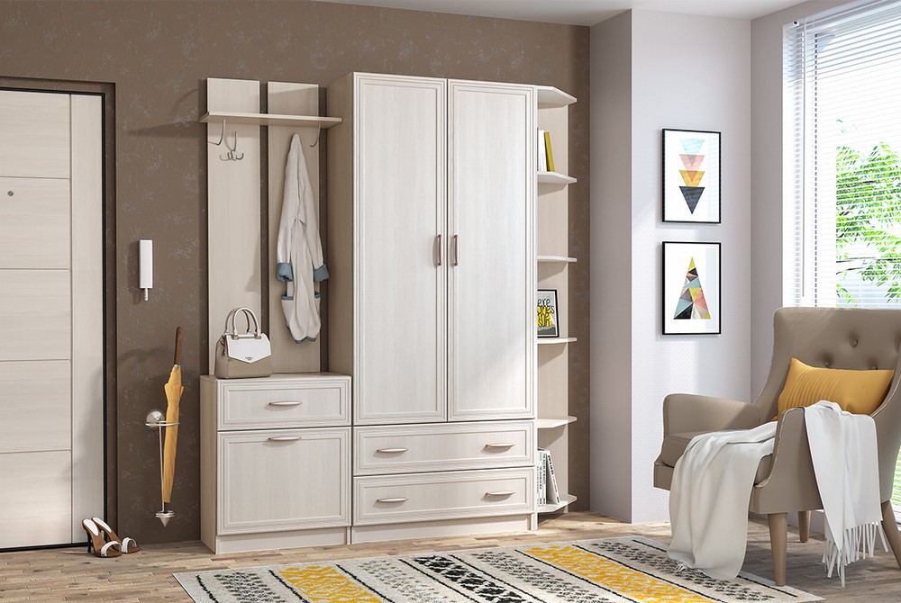 Вешалка с обувницей, два пенала с ящиками, угловой шкаф, открытая обувница.