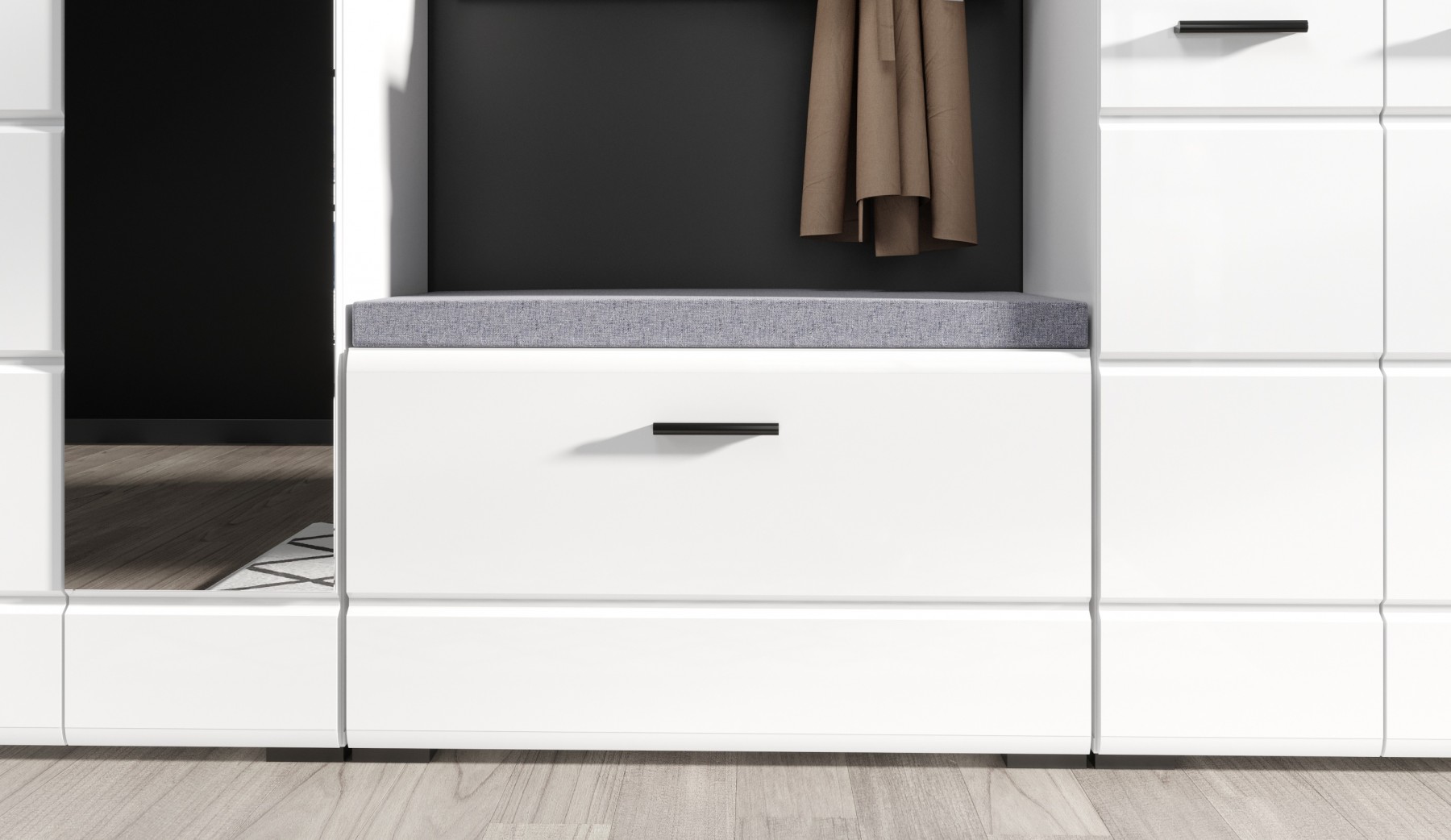 Прихожая Йорк выполнена в современном стиле – сочетает в себе функциональность и эффектный внешний вид: строгая горизонтальная фрезеровка фасадов, контрастные черного цвета ручки и задняя стенка из ХДФ. Глянцевые белые фасады High Gloss из МДФ и зеркала наполняют помещение светом, делают ее ярче и просторнее. Компактная и вместительная, с небольшой глубиной модулей, она поможет правильно организовать систему хранения даже в небольшом помещении.