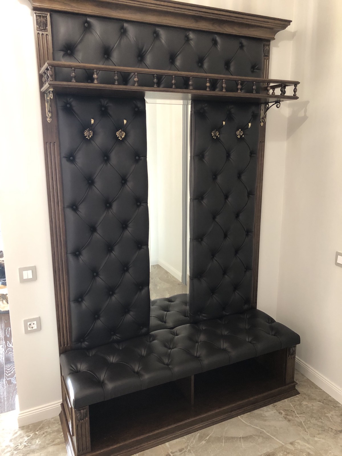 Корпус в цвете темного дерева, украшен фигурной резьбой в старинном стиле. Лицевая сторона - натуральная кожа с мягкой обивкой, дополненная декоративной стяжкой. Четыре металлических крючка для одежды по бокам от эргономичного зеркала. Внизу есть место для размещения обуви.