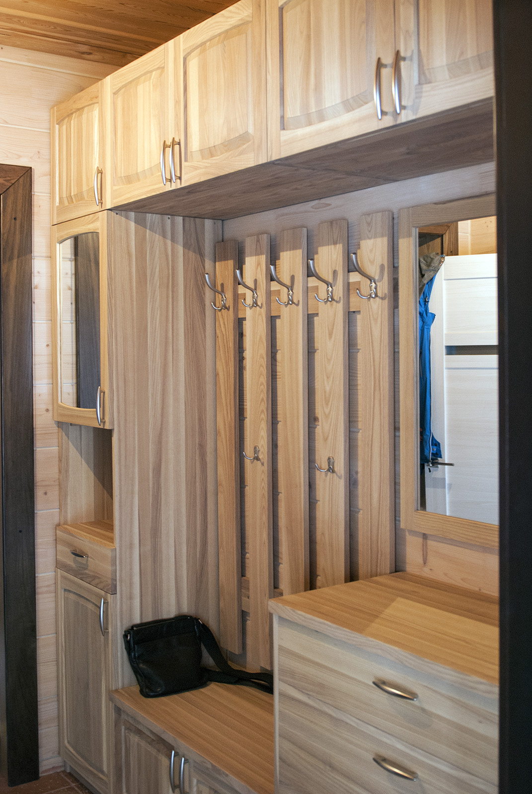 Оригинальный дизайн прихожей с большим зеркалом и вертикальными ручками, а также открытыми настенными вешалками.