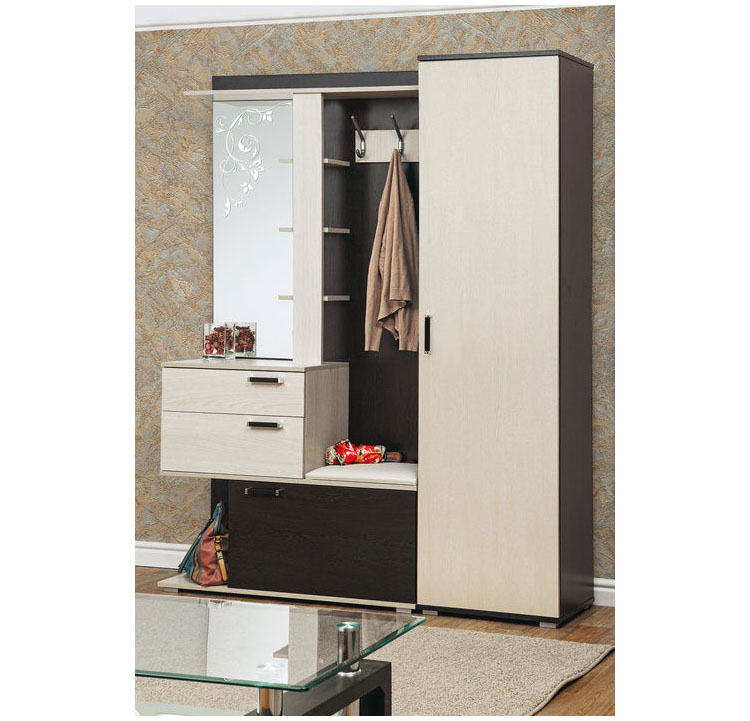Стильная прихожая из ламинированного ДСП «Кармен-3» обладает зеркальной створкой, украшенной интересным узором. Шкаф и полки оснащены фурнитурой с черным центром и белой окантовкой. Фасады изготовлены в комбинации светлого и темного цвета. Вешалка с металлическим крючком продлена вверх, за счет чего появляется дополнительный крючок.
