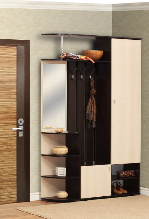 Шкаф для прихожей. Слева снизу - три открытые радиусные полки. Посередине – отделение с распашной дверью. Справа-отделение с распашной дверью и выдвижной штангой. Модель установлена на пластиковые опоры, не регулируемые по высоте.