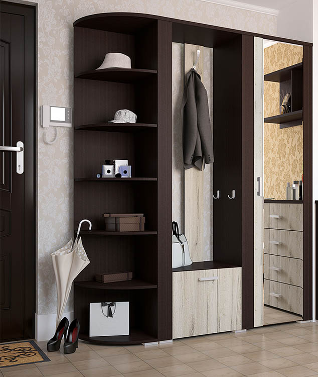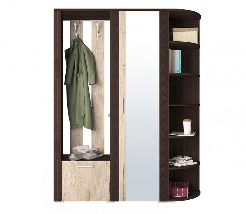 код 116417Открытые радиусные полки, распашной отсек с зеркалом на створке.