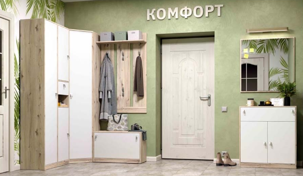 Мебель выполнена в модном сочетании древесного материала и белого цвета, благодаря чему прихожая Комфорт впишется в любой по стилю современный интерьер.