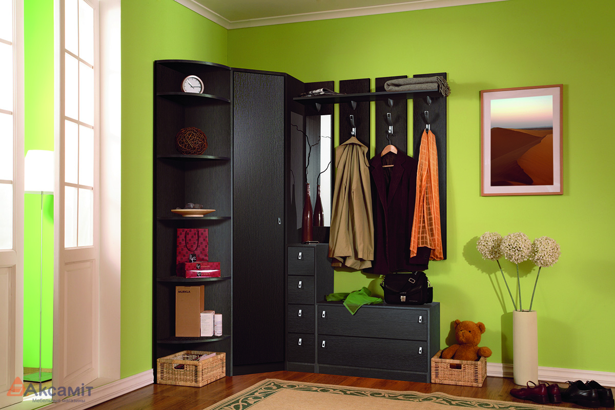 Состоит из отдельностоящих модулей: шкафа+ вешалки+ зеркала и обувниц.