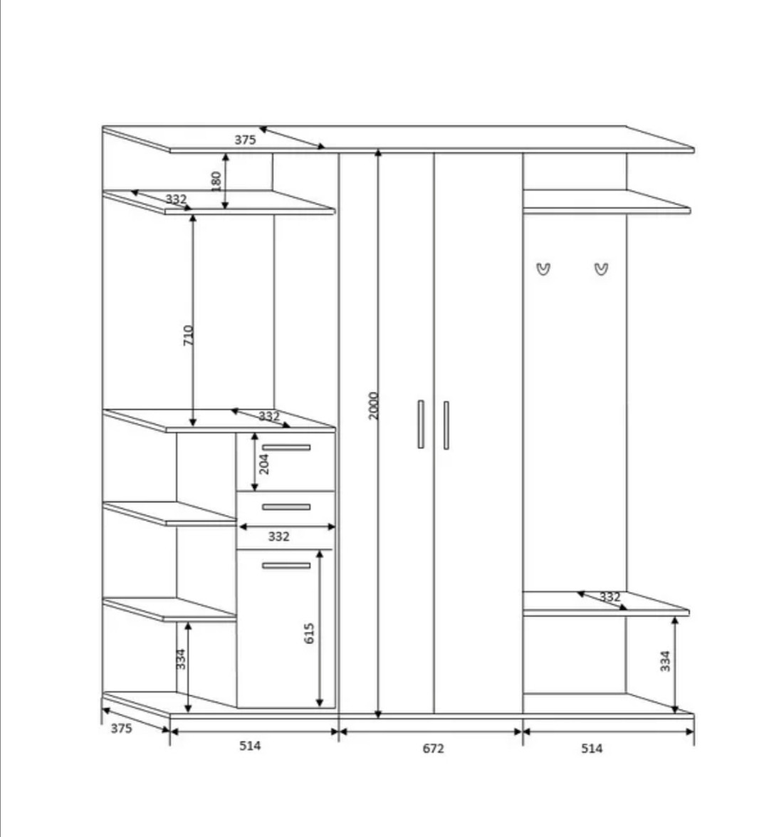 Эта прихожая создана, чтобы сделать вашу жизнь удобнее и уютнее. Двухдверный распашной шкаф предлагает вместительное пространство для хранения вашей одежды. Многочисленные открытые полки — это настоящий рай для тех, кто любит порядок. Здесь вы сможете разместить обувь, аксессуары, сумки и даже декоративные элементы интерьера. Каждая вещь найдет своё место, а ваша прихожая всегда будет выглядеть аккуратно и стильно.