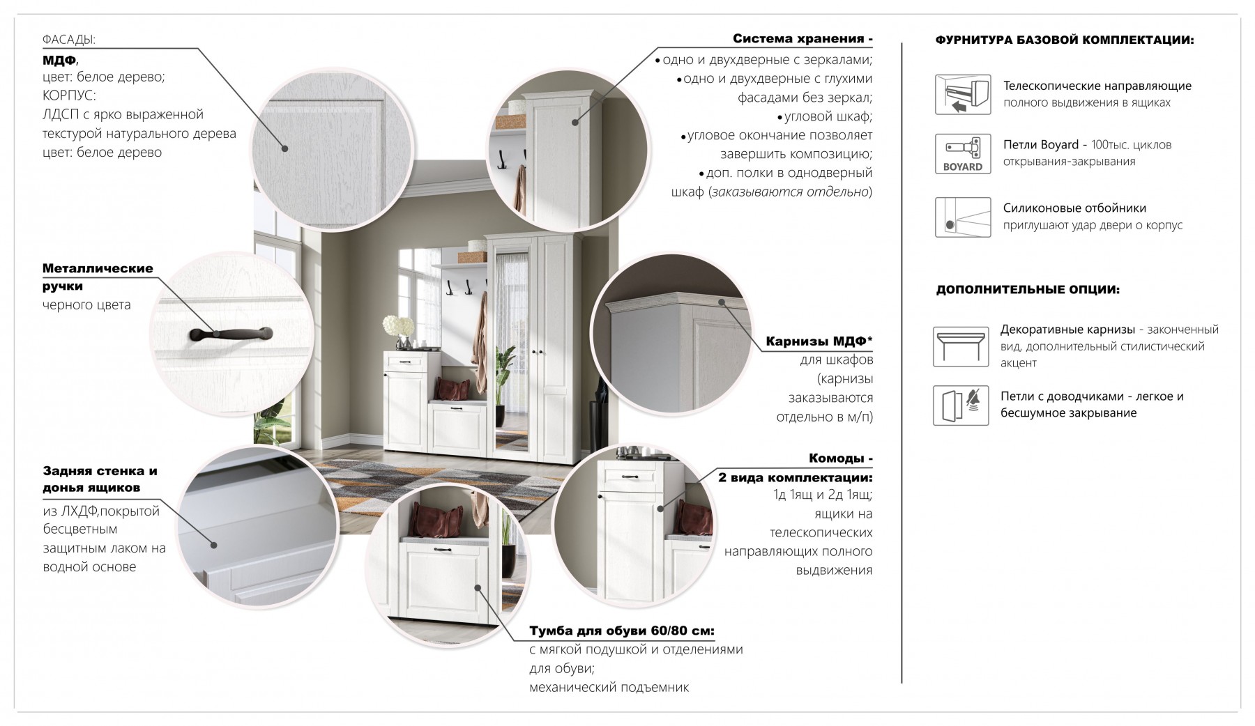 Коллекция мебели в стиле «легкого кантри» с белыми текстурными фасадами под дерево. Материал: МДФ покрытый плёнкой, ЛДСП.