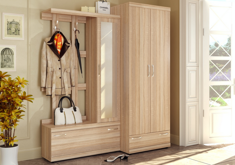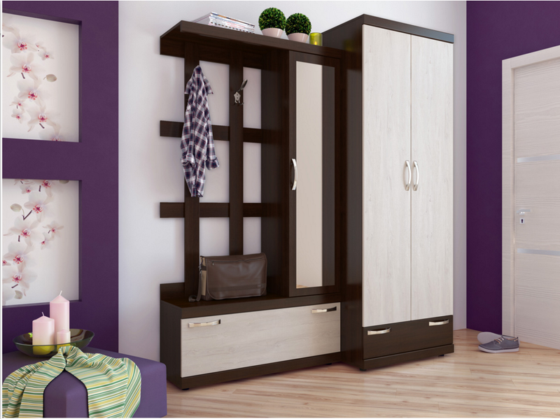 Прихожая с зеркалом, обувницей, крючками и шкафом.