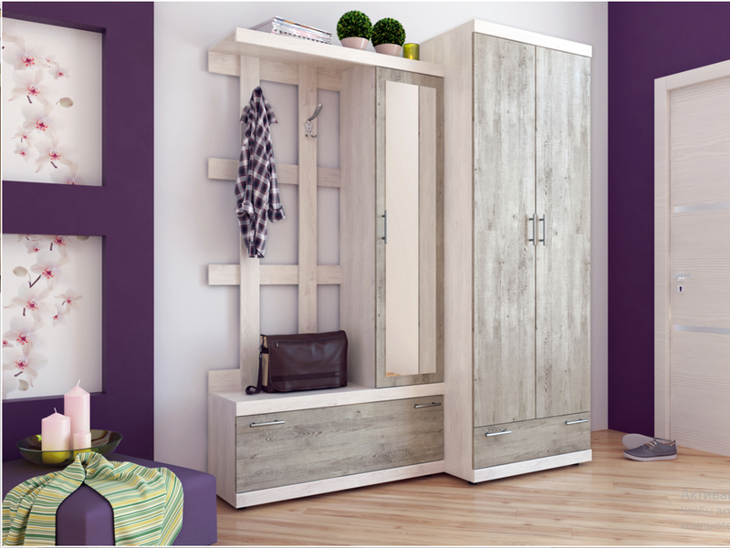 Набор мебели для прихожей представлен в нескольких цветовых вариациях. Однотонная расцветка фасадов в стиле близком к современному минимализму. Высокий двустворчатый гардеробный шкаф с выдвижным ящиком внизу. На компактный комод опирается остекленный однодверный модуль и служит дополнительной опорой полке для головных уборов. Дощатая настенная вешалка имеет два тройных крючка для верхней одежды.