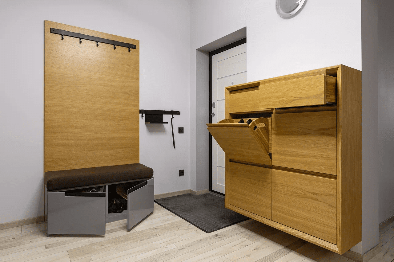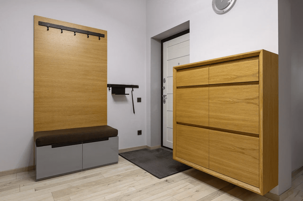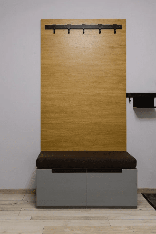 Прихожая состоит из вешалки с местом для сидения и просторным местом для хранения, "парящим" стеллажом для обуви.