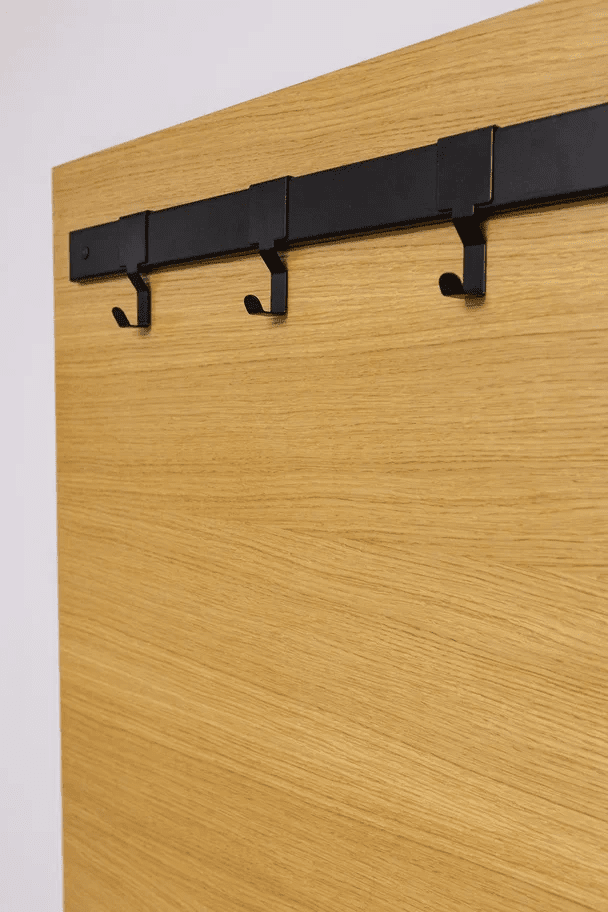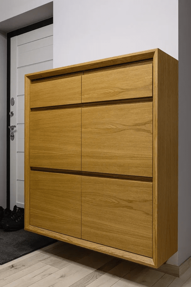 Уникальный стеллаж для обуви висит на стене, что значительно упрощает работу для робота-пылесоса, а запилы под углом 45 градусов делают эстетический вид стеллажа еще более уникальным и легким.