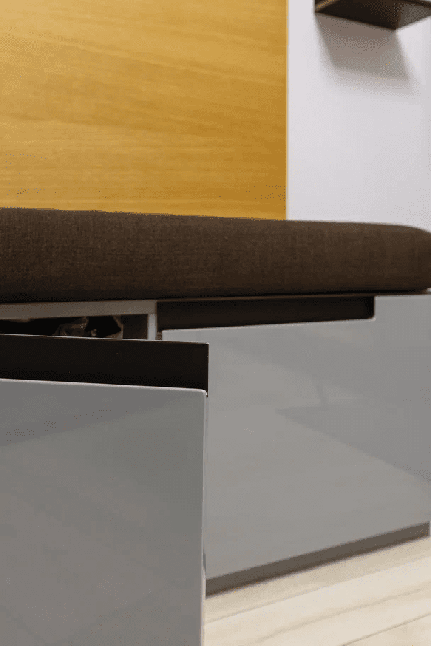 Мягкое сиденье в прихожей нашего производства. Фасады под ней - крашенный МДФ с фрезировкой ручек.