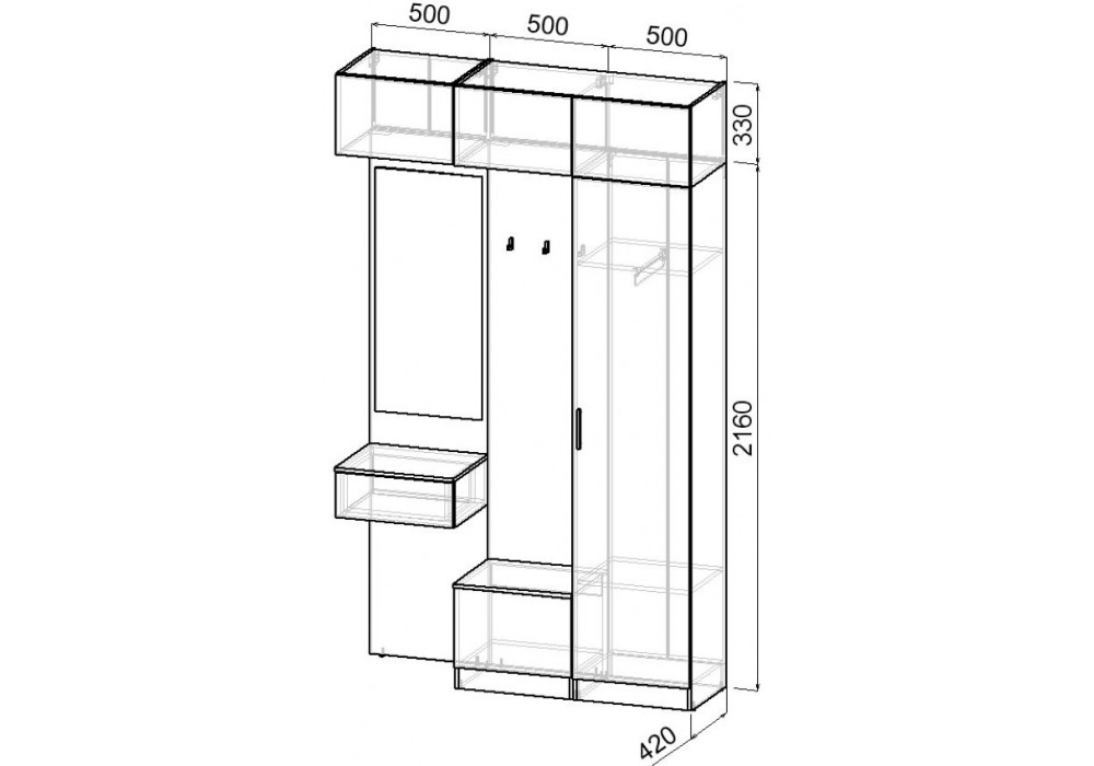 Зона с крючками для одежды, зеркало, открытые антресоли.
