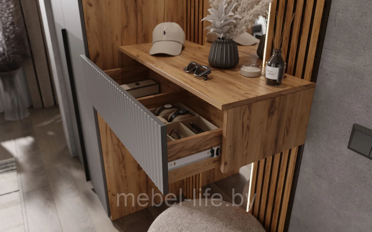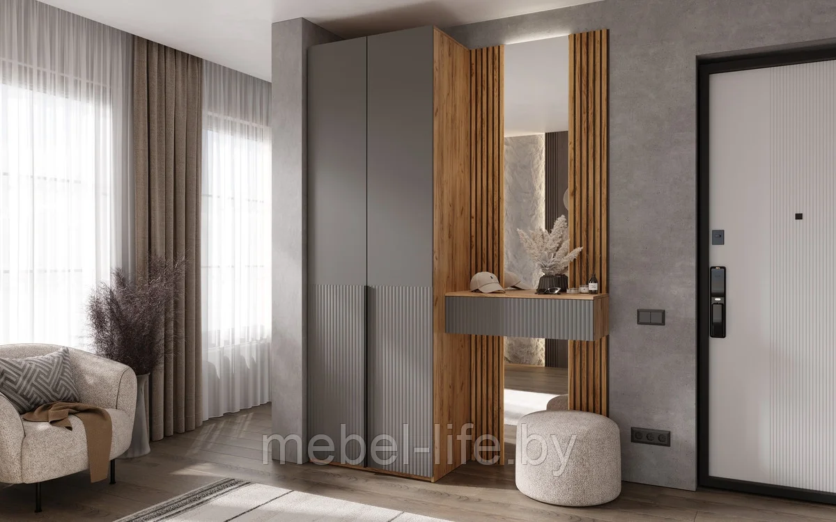 Шкаф с тумбой и зеркалом «Марвэл» - это стильный и функциональный комплект для Вашей гостиной, прихожей либо спальной комнаты. Его минималистичный дизайн сочетается с простотой конструкции и не перегружает интерьер лишними деталями. Шкаф оснащен полками, выдвижными ящиками и штангой для размещения одежды. Навесная тумба включает в себя выдвижной ящик, открытое пространство сверху и зеркало, что благоприятствует комфортным сборам и выходу из дома. Фактурные фрезерованные фасады из МДФ выполнены без ручек, открываются простым нажатием на край створки. Цветовое исполнение создаст атмосферу тепла и уюта в Вашей квартире.