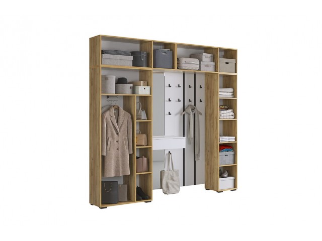 Практичная тумба с зеркалом, шкаф со штангой, вешалка для одежды и полки для вещей.